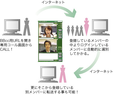 | 今までのビジネスシーンを大きく変えるインターネットというインフラを使ったTVコールセンターシステム。今までのインターネットTV電話では、単に特定の相手との通話のみという制限がありましたが、そこに初めて任意のメンバーで組む代表機能や転送機能を備える事により、一般固定電話でしかできなかったコールセンターシステムがインターネットTV電話で可能となりました。会社ウェブサイトからダイレクトにつながるウェブカスタマーセンターの創設など様々な用途で、御社をバックアップいたします。 | ![]() |